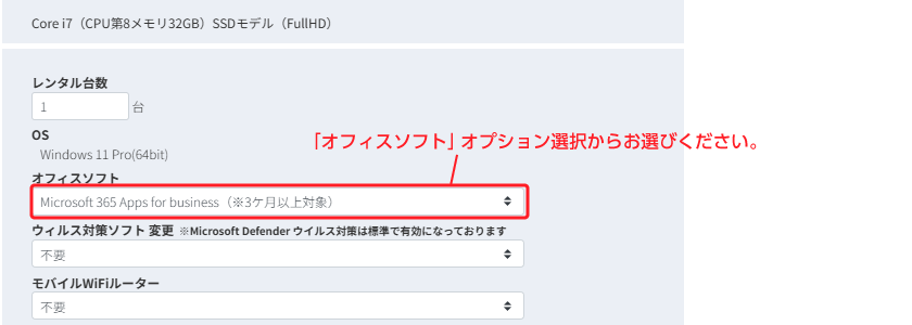 見積依頼画面のオフィスソフト選択から「Microsoft 365 Apps for business(※3ケ月以上対象)」または「Microsoft 365 Apps for business(※3ケ月以上対象)お客様インストール」を選んでカートに入れて下さい。