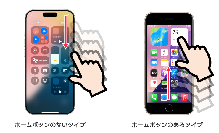 ホームボタンのないタイプのiPad、iPhone は画面右上からスワイプダウン、ホームボタンのあるタイプのiPad、iPhone 下からスワイプアップで表示することができます。