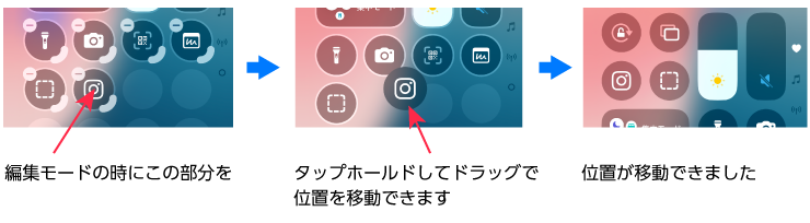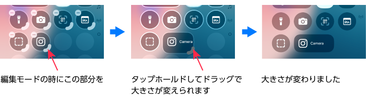 編集モードの画面でアイコンをタップホールドしてドラッグで位置を移動、右下の弧をドラッグしてサイズ調整が可能です。
