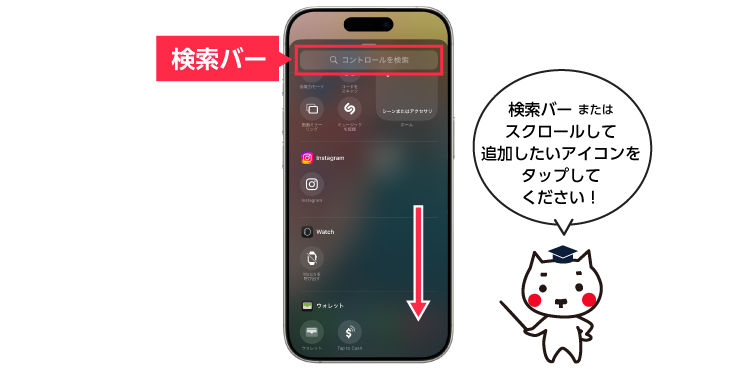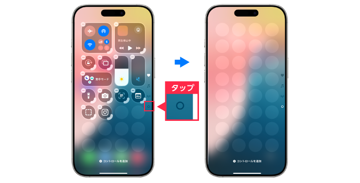 編集モード下部の「コントロールを追加」をタップしてギャラリーから選び、追加できます。
