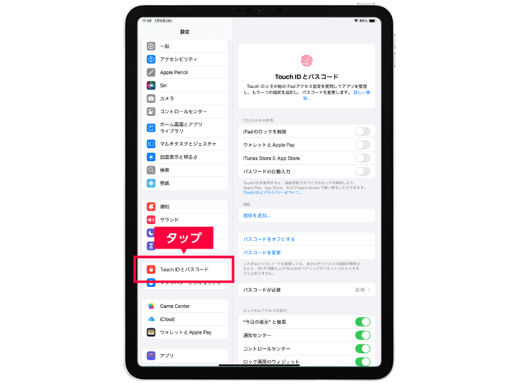 ❷「Touch IDとパスコード」又は「Face IDとパスコード」をタップします。