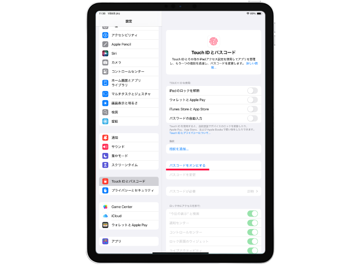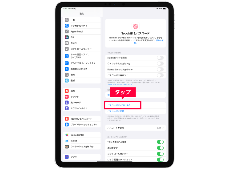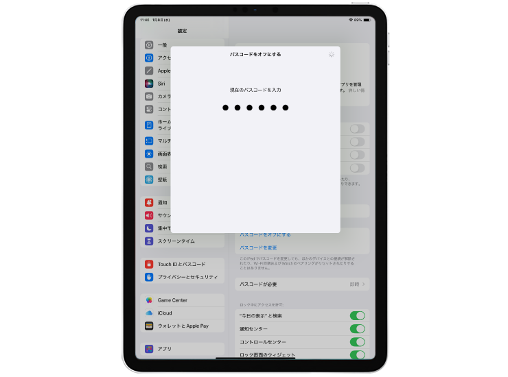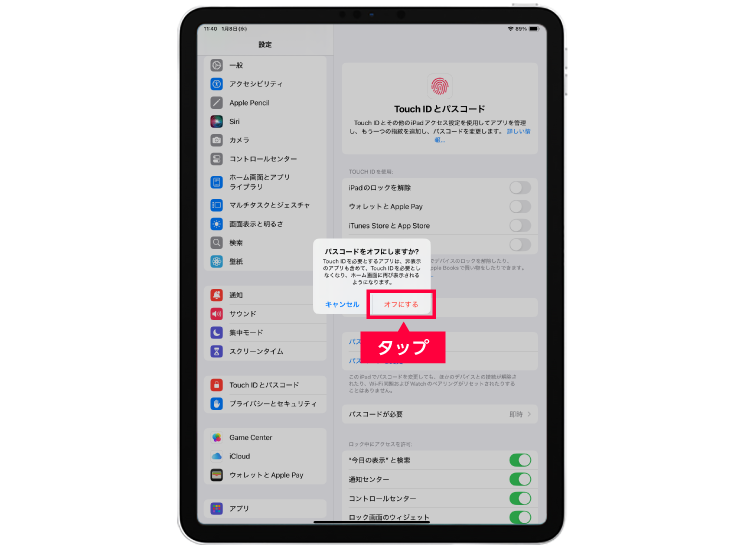 ❼「パスコードをオンにする」と表示されていれば、削除完了です。